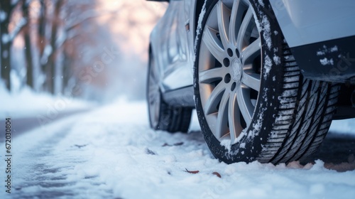 Close up of car tires in winter on the road covered with snow