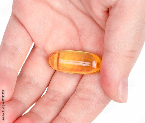 Close up of fish oil capsule on a hand isolated on white background