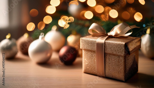christmas, gift, present, gold, luxury, elegant, bokeh, light, background, copy space, closeup, ribbon, bow, wrapping, paper, ornament, tree, brown, box, bauble, glittering, shiny, beige, special, modern, warm, night, house, home, apartment, festive, season, holiday, design, concept, advertising, selective focus, 2024, front, view