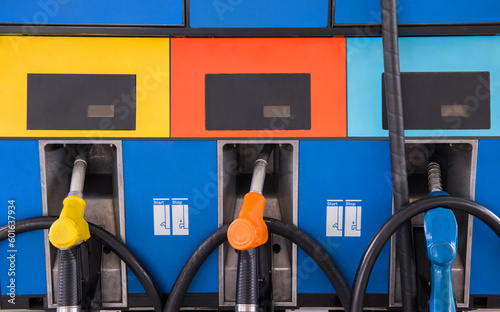 Close up of petrol fuel pistols at petrol station.