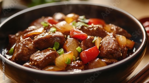 Close up of sukiyaki on black bowl