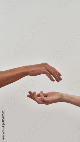 Close up of two open cupped hands with empty space between them isolated over light background