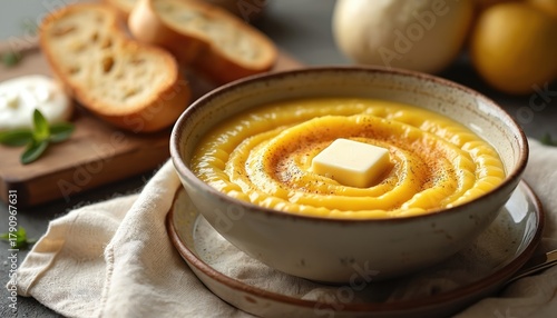 porridge, breakfast, cornmeal, food, meal, warm, comfort, butter, bread, toast, homemade, healthy, creamy, yellow, bowl, dish, rustic, cookery, epicure, culinary, cooked, morning, fresh, delicious, eat, tasty, mealtime, nourishment, simple, traditional, cosy, artisanal, closeup, whole, wholesome, background, table, cooking, receipe, diet, gold, baked, crust, ingredient, kitchen, studio, beige, plate, serving, food photography