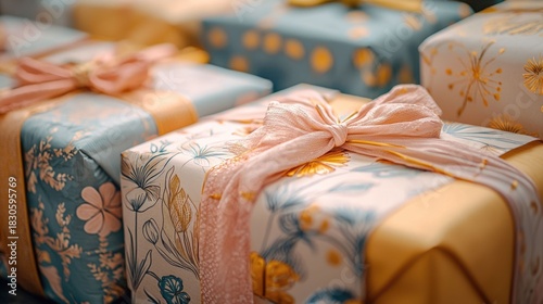 Close up shot of elegantly wrapped birthday presents tied with colorful bows and ribbons arranged in a festive party setting with vibrant wrapping paper patterns and textures