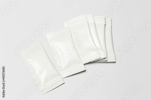 Close-up composition of white sachets on a white background.