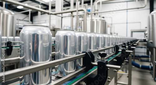 Close-up image of beverage cans lined up on a modern brewery assembly line