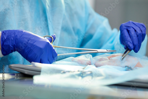 Close-up image of doctor's hands in protective gloves, surgeon leading operation on human hands, using instruments. Concept of medicine, hospital, healthcare, treatment, profession