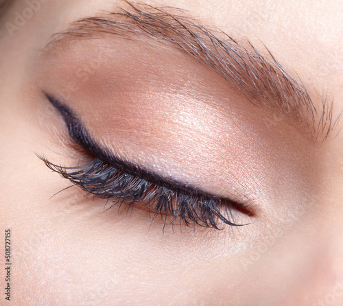 Closeup macro shot of closed human female eye with light pink eyes shadows