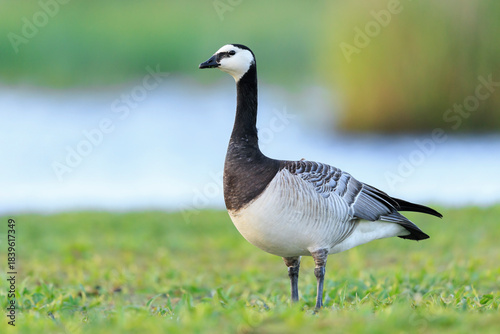 Closeup of a barnacle goose Branta leucopsis in a meadow