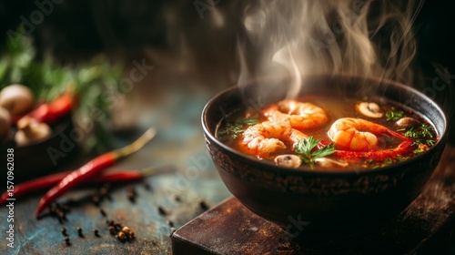 Close-up of a bowl of tom yum goong with succulent shrimp, mushrooms, and aromatic herbs, steam rising from the soup, evoking warmth and comfort on a rustic table