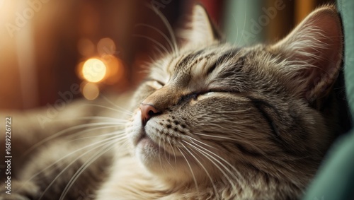 Close-up of a contented cat sleeping peacefully with eyes closed, showcasing relaxation and comfort. Cozy domestic scene emphasizing feline tranquility.