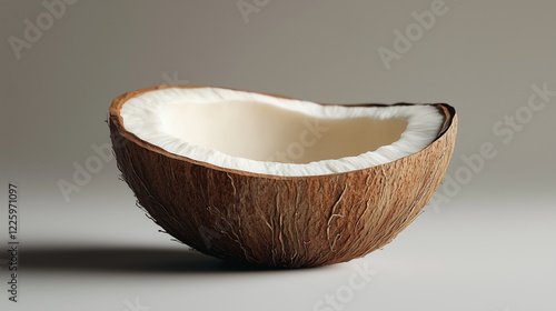 Close-up of a cracked tropical coconut revealing its white interior with detailed brown shell, isolated on a clean background