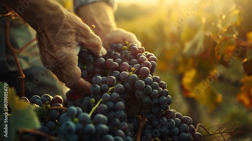 Close-up of a farmer's hands holding a bunch of ripe grapes in a lush vineyard during harvest season.