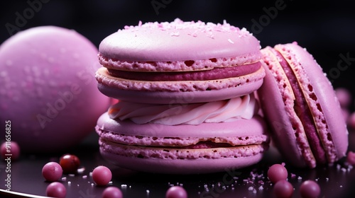 Close-up of a fresh macaroon, highlighting delicious textures, front view from above, studio lighting, white background.