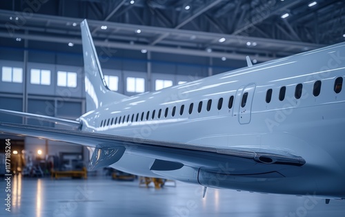 aeroplane, wing, flap, aircraft, aviation, technology, engineering, precision, hangar, industrial, smooth, white, closeup, detail, mechanic, sleek, modern, travel, flight, journey, machinery, metal, blue, grey, calm, serene, clean, shiny, glossy, nobody, no people, transport, vehicle, perspective, angle, texture, design, structure, powerful, efficient