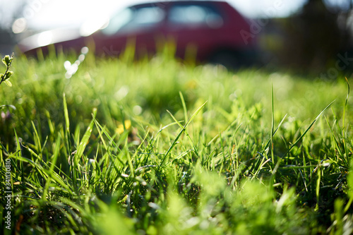 Closeup of a grass in the city meadow with a car in the background.