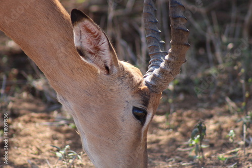 Close-up of a grazing male impala in Kruger National Park in South Africa