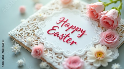 Close-up of a Happy Easter card with intricate lace details and floral patterns