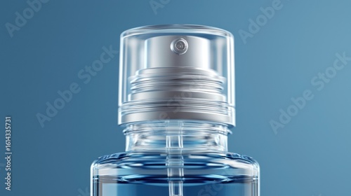 perfume, bottle, top, spray, clear, transparent, silver, metallic, blue, fragrance, liquid, glasses, closeup, detail, modern, luxury, design, elegant, fashion, cosmetic, product, cardboard box, detailing, sprayed, mist, odour, scent, essential, stylish, shiny, cap, atomizer, sparkling, refreshing, clean, subtile, light, premium, delicate, perfumed