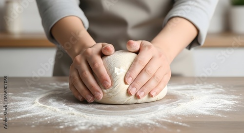 Close-up of a person's hands expertly kneading fresh dough on a floured wooden table, preparing homemade bread or pastries in a warm kitchen setting.