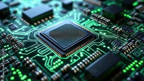 Close-up of a shiny black CPU chip on a circuit board with green glowing traces.