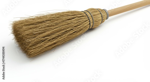 Closeup of a straw broom isolated on white background, ready for cleaning chores
