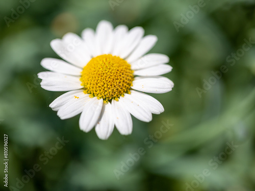 Close-up of a wild daisy flower (Leucanthemum vulgare), white chamomile on green blurred background.