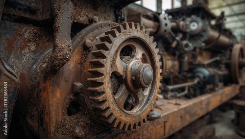 Close-up of deteriorated gear wheels from a malfunctioning industrial machine, maintenance risk