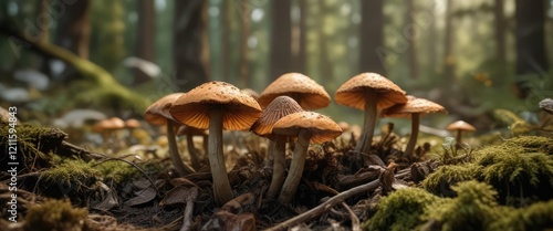 Closeup of dried mushroom caps in a forest environment, mushrooms, fungi