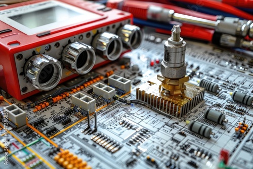 circuit, board, electronic, component, connector, metal, silver, gold, red, black, white, grey, orange, yellow, green, blue, wire, cable, solder, trace, text, number, symbol, device, technology, hardware, electrical, engineering, industrial, macro, detail, pattern, texture, abstract, background, digital, modern, futuristic, science, innovation
