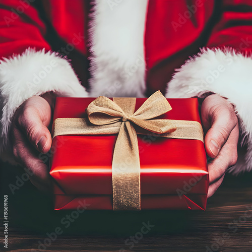 Close-up of Festive Red Gift Wrapped with Gold Ribbon Held Gently, Christmas Concept Photo.