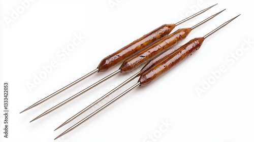 Close-up of Four Dark Brown Cylindrical Fishing Lures on Thin Metallic Wires Against White Background