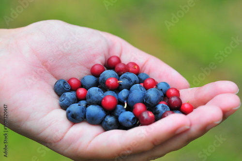 Close-up of hand holding freshly picked wild blueberries and lingonberries in natural outdoor setting