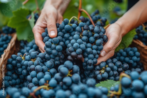 Close-up of hands harvesting ripe blue grape clusters into a wicker basket in a vineyard