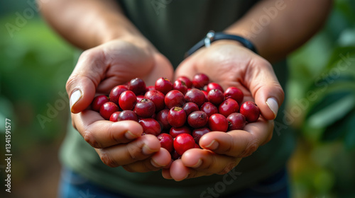 Close-up of hands holding freshly harvested red coffee cherries, symbolizing sustainable farming and organic coffee production. For agriculture, food packaging, advertising or coffee branding.