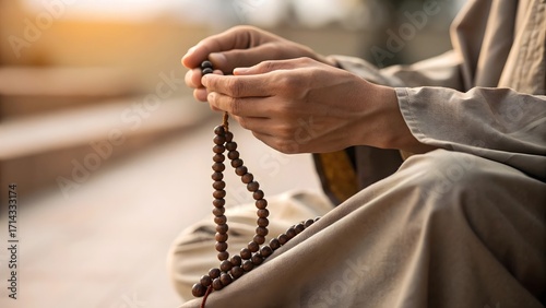 Close-Up of Hands Holding Prayer Beads in Meditation, Spiritual Focus