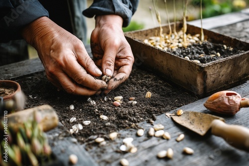 close-up of hands planting seeds in moist soil with gardening tools and compost
