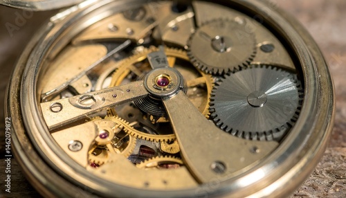 Close-up of intricate clockwork mechanism, revealing gears and intricate details. Vintage pocket watch interior.