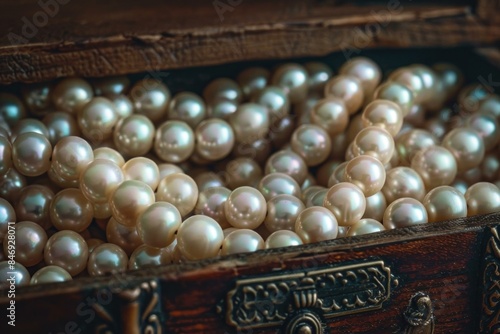 Closeup of lustrous pearls nestled in a vintage wooden treasure chest