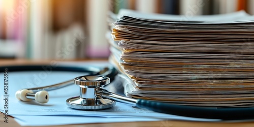 medicals, document, stethoscope, health care, hospital, clinic, record, file, paperwork, office, desk, glasses, clipboard, folder, chart, diagnosis, medicine, report, equipment, patient, physician, storage, paper, coloured, stack, copy space, health, care, computer, doctor, instrument, keyboard, tool, laptop, money, closeup, test, diagnostic, object, metal, insurance, cardiology, treatment, exam, technology