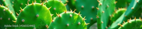Close-up of prickly pear cactus pads, vibrant green hues, flora, spines, prickly pear