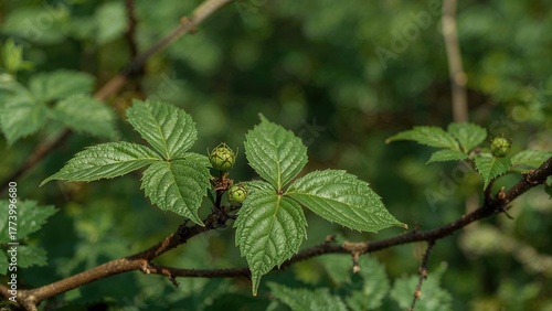 raspberry, plant, closeup, green leaf, tree branch, fruit, botanical, nature, agriculture, fresh, seasonal, healthy, organic, flora, detailed, vibrant, growth, no people