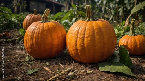 Close-up of ripe pumpkins on the ground in a garden setting with green foliage