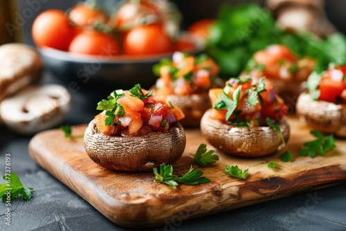 Close-up of stuffed mushrooms with tomato salsa, herbs, and cherry tomatoes.