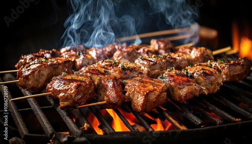Close-up of succulent lamb skewers grilling with visible smoke and a crispy, caramelized