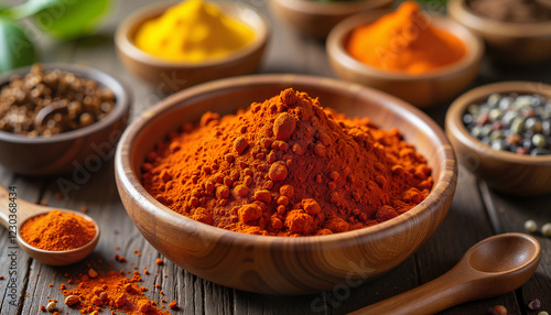 Close-up of vibrant berbere spice in wooden bowl, culinary artistry