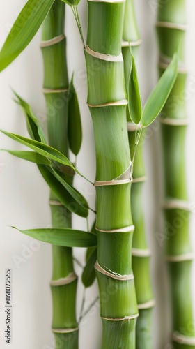 Close-up of vibrant green bamboo stalks with fresh leaves, natural and sustainable concept