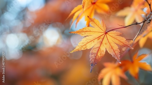 Close-up of vibrant orange and red autumn maple leaves with a blurred background, capturing the beauty of fall foliage in detail.