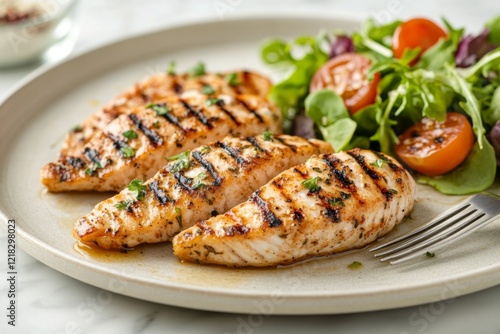 Close-up photo of grilled fish fillets on elegant plate with salad