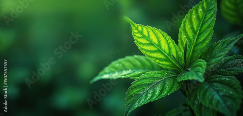 Close-up photo of rich green plant leaf. Green leaves, veins, water drops. Fresh, nature, eco friendly concept. Illustrates growth, organic, life. Ideal for design backgrounds, eco tech, sustainable,